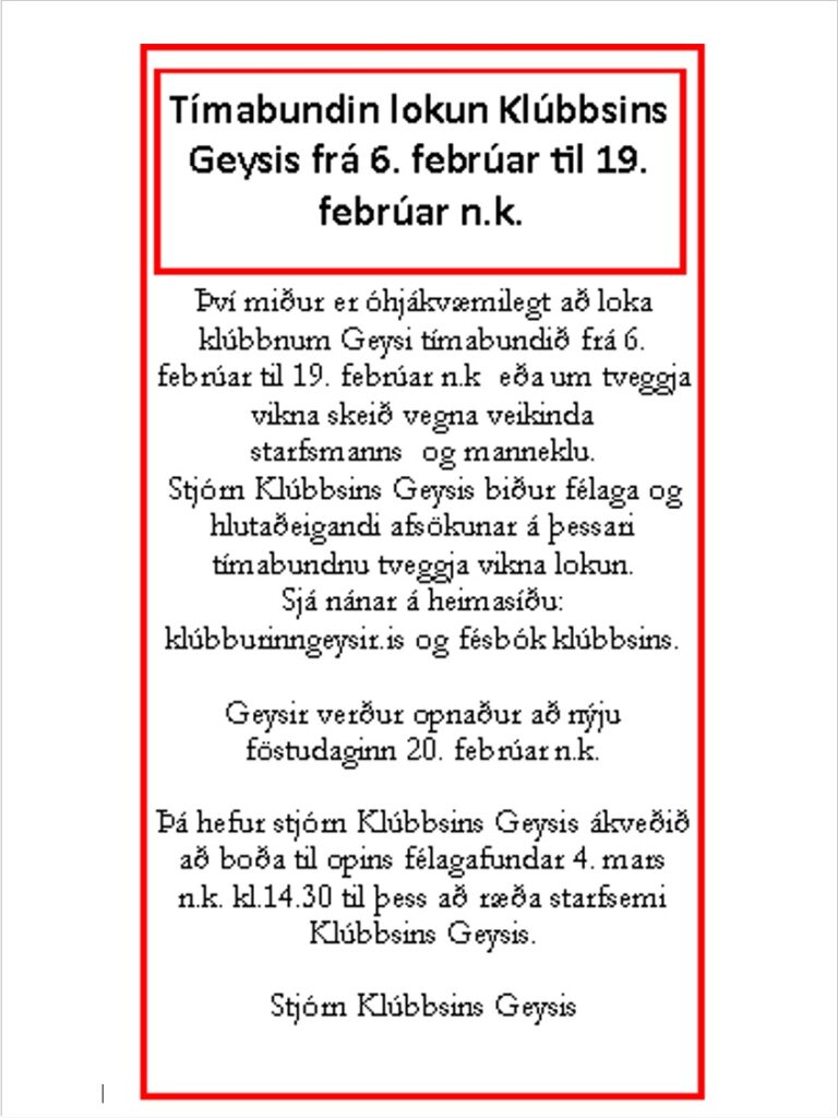 Lokað verður í Klúbbnum Geysi frá 22 desember-5 janúar. Hlökkum til að njóta með ykkur síðustu dagana sem framundan eru.